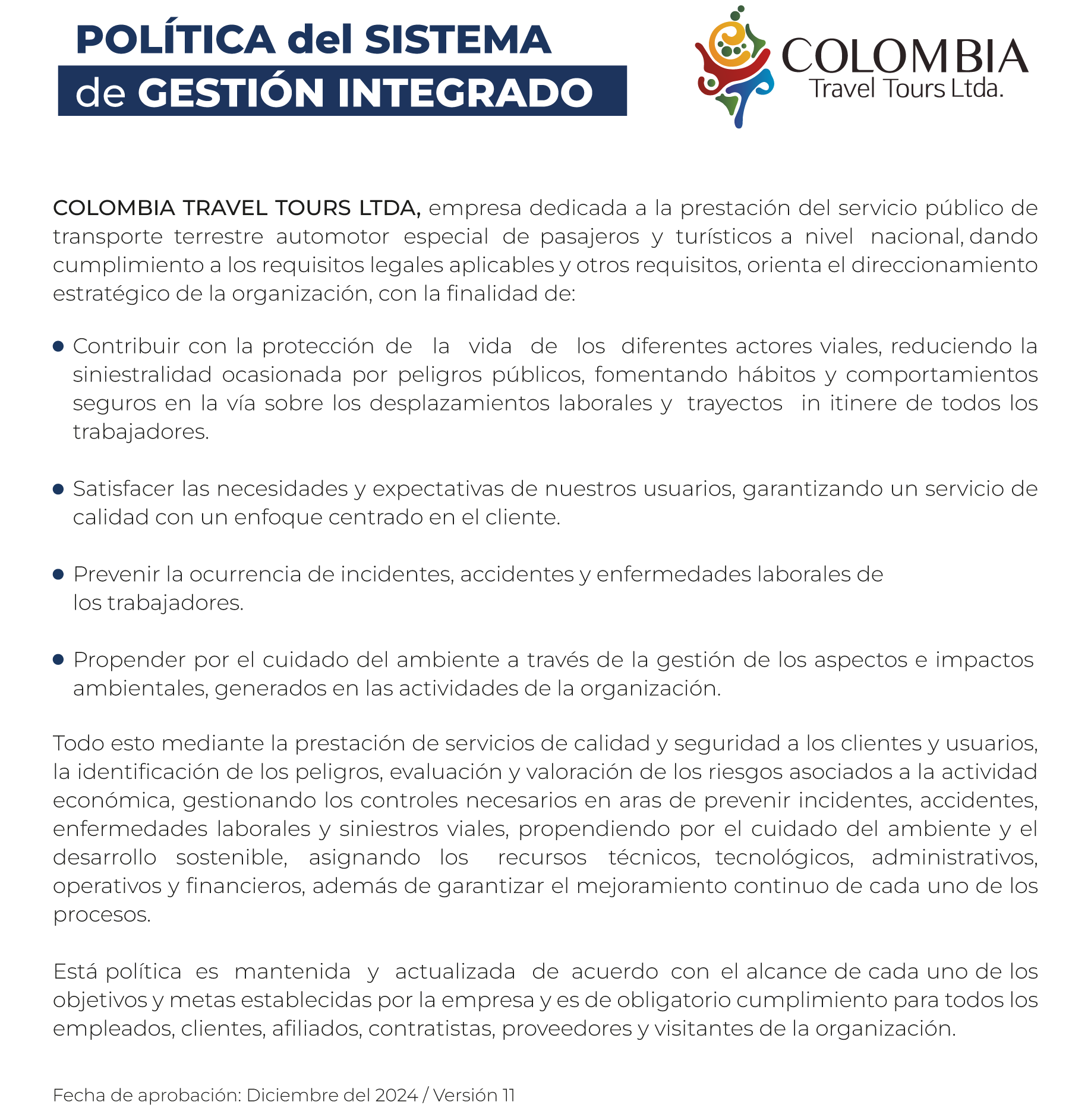 Somos una empresa colombiana que presta el servicio de Transporte terrestre especial de pasajeros y de turismo con cubrimiento nacional, orientada a brindar un servicio de calidad a nuestros usuarios y a cumplir con las necesidades de las partes interesadas, en donde la seguridad, la puntualidad, la comodidad y la tecnología se reflejan en un buen nombre en el mercado y en el sector empresarial, buscando los mejores resultados para nuestros accionistas, afiliados e inversionistas.